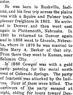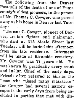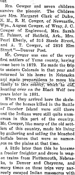 John Cowger died close to Hale, Colorado in the winter of 1886-1887, was buried