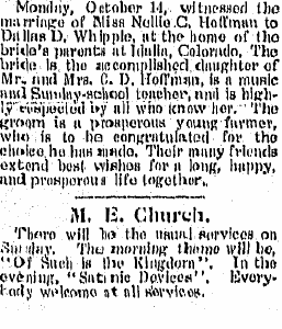 1914 "Marriage license was issued July 3, to Dallas Dunbar Whipple and Miss Alma Helene Juhl, both parties residents of the Hale neighborhood. The marriage was performed Sunday."