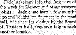 1911 Steamboat Springs "Jack Ackelson of Stratton, Colorado, who has been at the Albany for the past few weeks, departed this morning for his home."