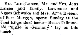 June 1963 "Mrs. Anna Price and three daughters and a grandson of Denver called on the William Doddridge* on Friday. Mrs. Price is the daughter of the late Jens Larsen from whom the Doddridge* bought their farm 45 years ago. The Larsons moved to Burlington where they resided until their death. She was on her way to Bur. lington to visit a sister."