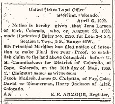 Jens proved up on a quarter in 4, 5S 46W in 1910, witnesses Jacob Madsen,