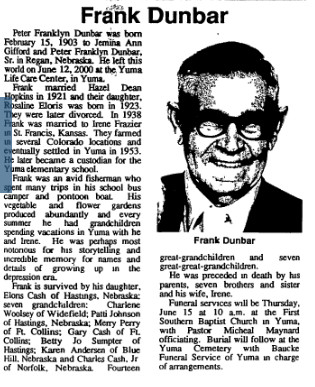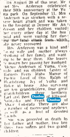 "Survived by her husband, John Bailey of Yuma, brothers Lester of Bonners Ferry, Idaho, and Ralph Anderson of Yuma, niece Belva Miller of Yuma, uncle Frank Dunbar of Yuma, and many nieces and nephews.