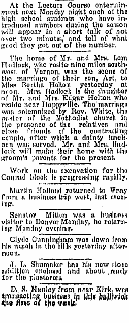 "E. Helton of forty miles south of Yuma came to Wray Friday to witness the