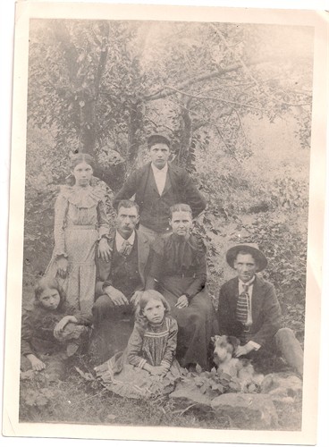(standing) Lura Maud, Grover Earl, (sitting) George Douglas, Mary Ellen Josephine, (ground) Elma, Georgia, & Tice Woods.