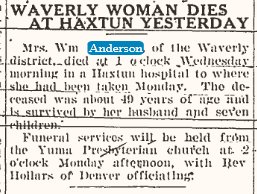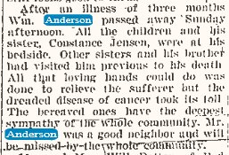 January 1937 "Mrs. Constance Jensen, a sister of Wm. Anderson, came in from Bloomington, Nebraska Friday to attend the funeral of Mrs. Anderson."