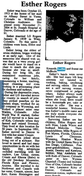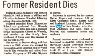 May 1, 1986 "Sympathy is extended to the family of Mildred Anderson, a former resident of the community who passed away in Denver."