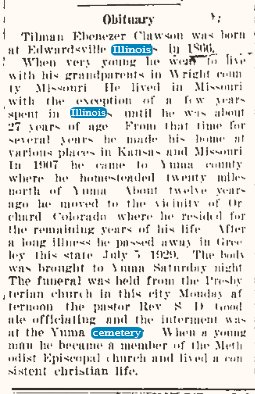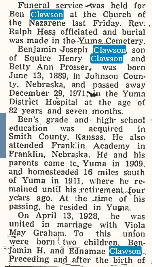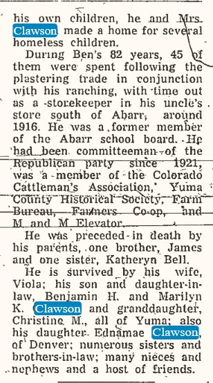 In 1910 Yuma County, "Ebenezer" Clawson is farming, living alone, 45, born in Missouri(probably wrong.)