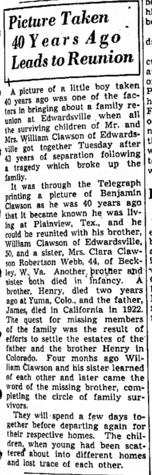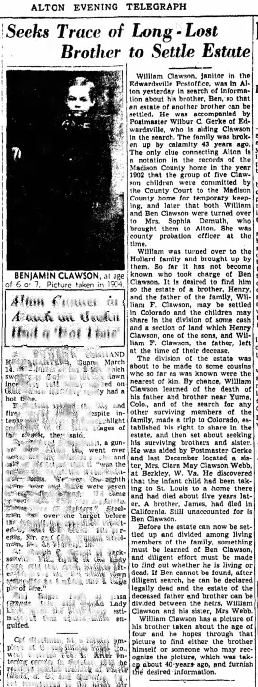 William Holland Clawson and Anna K,. Menching had Harold William Clawson in Edwardsville, who on June 1, 1946, age 23, married Jane Lorraine Ayote in Allen Park, Michigan.