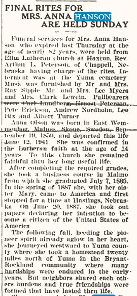 In 1900 Yuma County, Charles O. Hanson born June 1849, married nine years to Annie Sept 1858, are farming, with William Jan 1893 and Headwig Nov 1894, both born in Colorado.