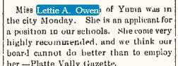 1899 Yuma "Miss Lettie Owen was a Fort Morgan visitor the fore part of the week."
