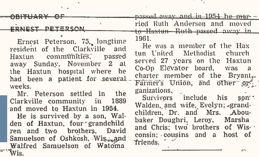 She came to America in October, 1919 OR 1910?????? and lived with her aunt, Mrs. John Nordholm, until May 24, 1923 on which date she was married to Ernest Peterson of south of Haxtun. To this union one son - Walden - was born.