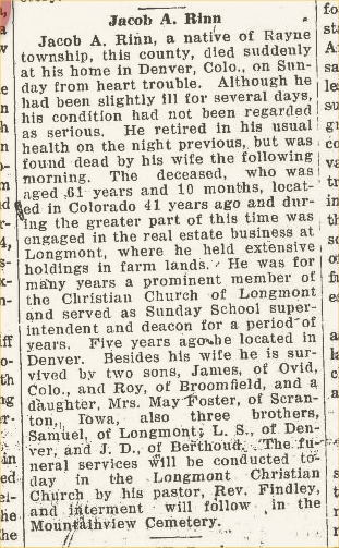 1908 :Jacob Rinn, wife and daughter of Platteville and Ovid Webb and wife of Estes Park were in attendance at the funeral of the infant son of Mr. and Mrs. C.J. Rose Sunday afternoon."