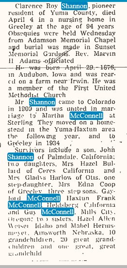 In 1910 they're in Sterling, Colorado, farming, Clarence 34 and Martha 38 both born in Iowa. This is his first marriage, her second. Gaylord McConnell is 12, Frank 10, Guy 8, Edna 6, Wayne 4 all born i Iowa, and their daughter Gladys five months.