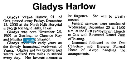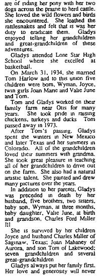 Gladys, born November 25, 1909, died in Fort Worth Texas December 15, 2000.