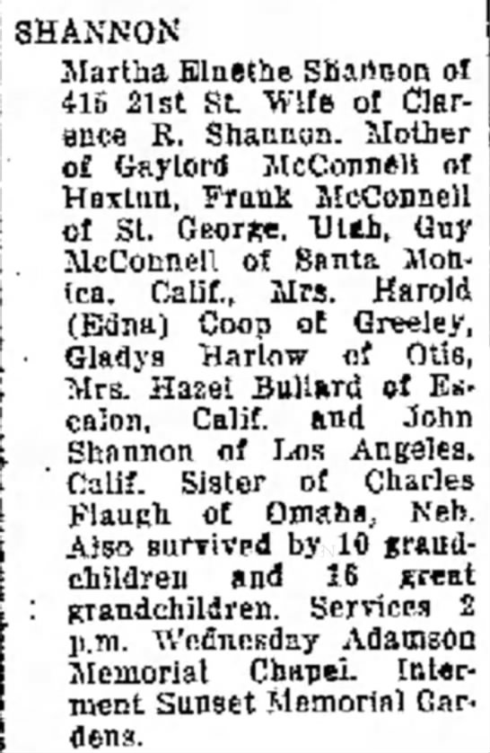 May 8, 1924 "Mrs. C.R. Shannon, of twenty miles north of Yuma, ws called to Hartington, Nebraska, Monday by the death of her mother.