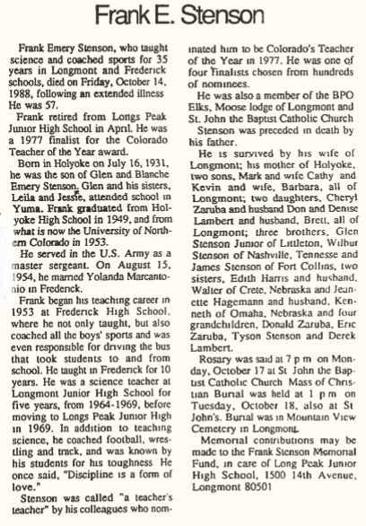Jeanette and husband Major General [Ret.] Kenneth Hagemann of Omaha, NE; daughter-in-law Yolanda Stenson of Longmont; 24 grandchildren; 43 great grandchildren; brother Elmer Emery and wife of Redmond, OR and a number of nieces and nephews.