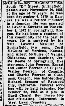 In 1885 Allen County, Kansas, Wm. McGuire is 51, farming, Eva C. 35. With them are J.W. Stenson 16, Richard Stenson 14, Wm McGuire 16, Walter McGuire 10, Noble McGuire 8, Royal McGuire 5, an Iona J. McGuire 3.