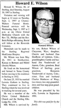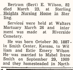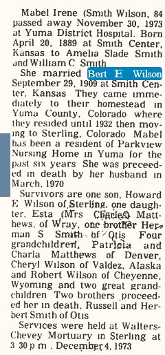 January 1963 Yuma "Relatives from out of state who attended the funeral of Bert E. Wilson were Mr. and Mrs. Rex Roberts of Allerton, Iowa and Mr. and Mrs. Lawrence Bolton of Chicago, Illinois."
