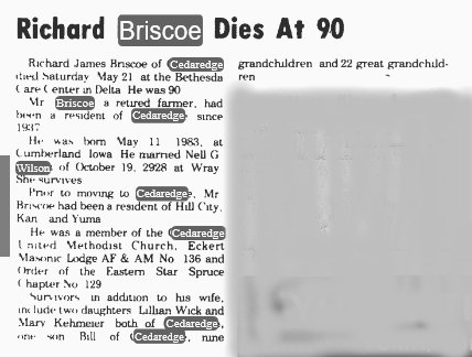 In 1974 Mrs. Orville Cook died at Cedaredge, born Cora Zell Slater in 1899 in Smith County, marrying in Yuma 1918. Her sister was Mrs. Nell Briscoe of Cedaredge.