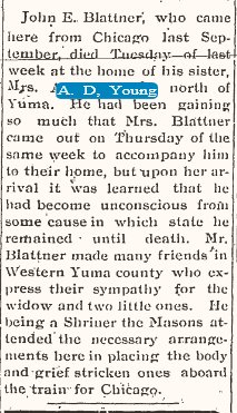 March 1915 "Mr. and Mrs. A.D. Young came down from Brush Wednesday morning. Mr. Young has sold his restaurant business in Brush, and the family have returned to Yuma."