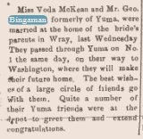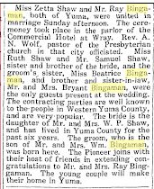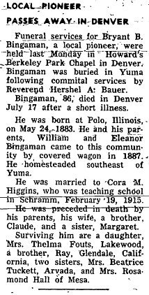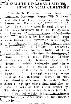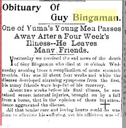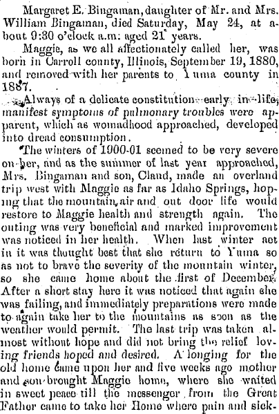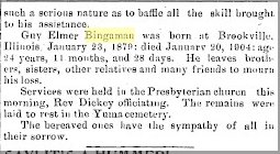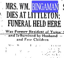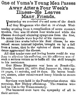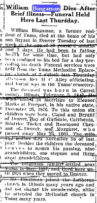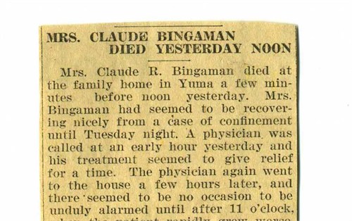 January 5, 1907 "The little son of Mr. and Mrs. C.R. Bingaman died in Denver last Saturday. The parents brought the little body to Yuma on Sunday evening and the funeral services were conducted Monday by Rev. Nolte of the Methodis church."