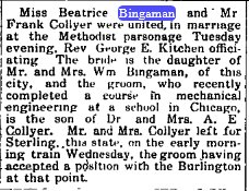 Frank A. Collyer and Beatrice F. Bingaman had Eleanor Aldene Collyer on November 15, 1918 - she died as Eleanor A. Graham in August 2001..