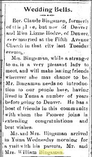 October 1, 1909 Yuma "Services in the Methodist church both morning and evening when Rev. Clude BIngaman will preach at one or both services." - the Rev. A. Hawks is the pastor.