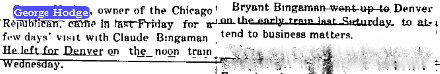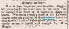 1901 "Claud Bingaman and his mother are expected to return in a few days. Miss Maggie will remain in Idaho Springs for some time yet."
