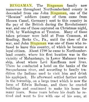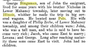 George Bingaman and his wife, Margaret Sarber Bingaman, were both born in Northumberland county, Pennsylvania, the former November 13, 1803, and the latter January 29, 1803. They were married in 1825. In the fall of 1841 they came west and settled at Chambers Grove where Mr. Bingaman bought 700 acres of land. On October 19, 1847, while driving along the road in the timber in Whiteside county, Mt. Bingaman was accidentally shot by a man who was shooting at quail in the brush. He lived but a few hours. Thus Mrs. Bingaman was left a widow with a large family, the youngest but an infant. But with the heroic courage of the pioneer mother, she kept her family together and lived to see them all grown and settled in life. Her last years were spent in Polo, where she died July 11, 1894. The eldest son, John, 19, shared the care of the farm with his mother, sisters and brothers and afterwards became a leading and successful farmer in the community