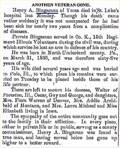 September 1901 "The Bingamans received a telegram Tuesday stating that County Commissioner Henry Bingaman was seriously ill and not expected to live. His son, Oscar, and his brother, William, left on the first train and are with him at the hospital in Denver."