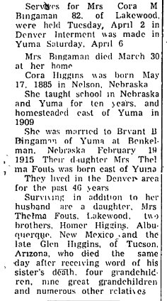 Mrs. Bingaman died March 30 at her home. Cora Higgins was