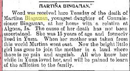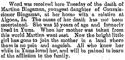 1899 Yuma Pioneer "County Commissioner Bingaman was on the sick list Friday and Saturday of last week."
