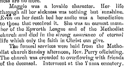 The funeral services were held Sunday at the home of the sorrowing parents, Rev. E. G. Ingraham officiating.