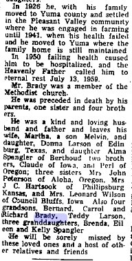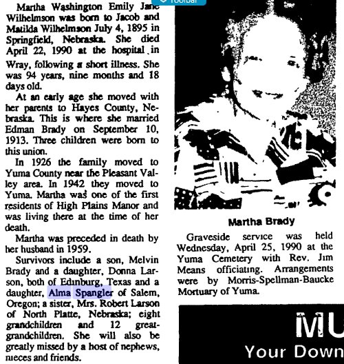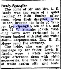 Warren Lee Spangler of Salem died on Dec. 9, 2001 in Salem. He was 75. He was born to Harvey and Lucy White Spangler in Haigler, Neb. As a young boy he moved to Otis, Colo. where he lived until he joined the U.S. Marine Corps. After he completed his duty he returned to Otis and lived there until 1950. On April 17, 1949 he married Alma Brady in Yuma, Colo. The couple moved around Colorado for a number of years before moving to Reedsport in 1965. In 1967 the family moved to Salem. He retired from the Boilermakers Blacksmith Union Local No. 500. He enjoyed art, drafting, hunting and tinkering with cars. Survivors include his wife, Alma of Salem; son, Korey of Salem; daughters, Brenda Paull of Vancouver, Wash., Eileen Terhes of Salem and Kelly Yustin of Aloha; stepmother, Wilma Spangler; stepbrothers, Emery, Kenneth and Richard; stepsister, JoAnn Beeman; six grandchildren; and four great-grandchildren Warren is buried in Willamette National # 36370292. Harvey Warren Spangler 1900-1976 is buried in Payette County, Idano # 16752515, Lucil3 1906-1937 in Haigler Nebraska # 42615051 (Harvey married Wilma Hooker 1915-2006). |