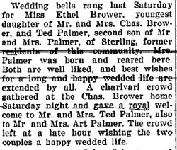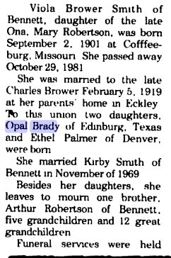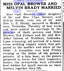 Branch. Interment was in Mountain View Cemetery. May 3, 1928 "Ruby and Ruth Northcut, Donna and Melvin Brady, Geneva Woodcock and Beulah Monk were guests of Miss Velma Herbaugh and Opal and Ethel Brower Sunday afternoon." Charlie applied for a BrowerPatent.pdf in 1928 for a "seeding machine" - usually called a "planter." In 1930 Charlie and Viola have Opal A. 8, born in Colorado, and Ethel P. 6. In December 1939 "A large crowd attended the bridal shower for Miss Opal Brower at the home of Mrs. Geo. Fix Tuesday of last week."January 4, 1940