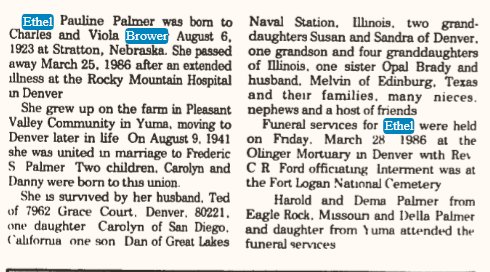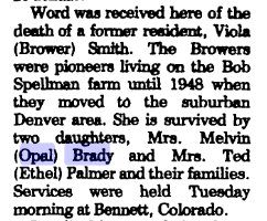 This is almost certainly FREDERICK S. Palmer in 1930 Sterling, Colorado with parents Amos and Ethel. Siblings are Robert A. 25, Hazel M. 16, Frederick S. 13, Marjorie A. 11, and Arthur L. 8. In 1940 Frederick is 23, a hired hand for Charlie Brower. In 1940 Denver, Melvin B. Brady is 24, Opal A. 18. Melvin Bernard Brady was born Jan 21, 1916 at Hayes Nebraska to Lewis E. Brady and Martha Washington, dying Jan 22, 2003,, lasat residence Hidalgo County, Texas. November 5, 1942 "A son was born to Mr. and Mrs. Melvin Brady in Denver last Thursday, called Bernard Stanley. Grandparents Mr. and Mrs. Chas Borwer and Mr. and Mrs. Ed Brady of Yuma." In 1943 Melvin and Opa and son moved to the Chas Brower farm where they will assist Mr. Brower with his blacksmith work." )that building is still standing, a shop at 15050 Road 53.) In 1949 Opal Brady, of Edinburg, Texas, served the cake at the wedding of Alma Esther Brady, daughter of Lewis E. Brady, to Warren Lee Spangler of Otis. 1971 Harlingen, Texas "The engagement of Miss Cecilia Dawn Savage, daughter of Mr. and Mrs. Judson C. Savage of Raymondville, and Carrol Francis Brady of Corpus Christi was announced Friday at a large tea given by Mrs. Richard Willard Hutchins Jr. at her home in Raymondville. The future bridegroom is the son of Mr. and Mrs. Melvin Brady of Edinburg." 1985 Yuma "Jennie Johnston and Phoebe Josh visited Melvin and Opal Brady of Texas who have been visitin ghes mother, Martha Brady. Ethel P. Palmer 1923-1986 buried in Fort Logan "Wife of Frederic S. Palmer" # 36085117.