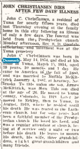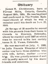 In 1910 Yuma County, James M. Christensen and Julie F. are both 25, Alice E. 3, John C. 2, and newborn Grace M.