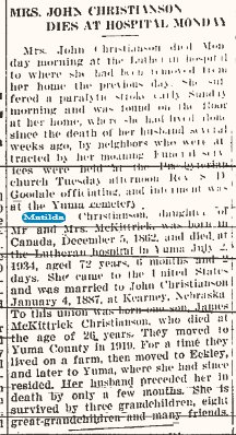 Matilda McKittrick, 24, born in Canada, to James and Elizabeth, married John C. Christensen on January 4, 1886 in Kearney, Nebraska.