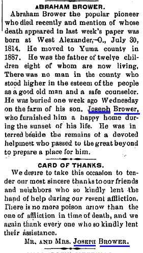 1906 "Mr. Joe Brower drove over from his ranch north of town Monday, returning