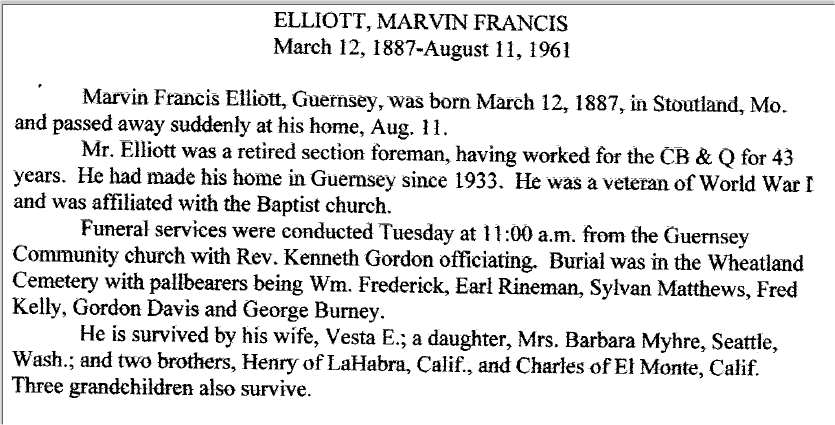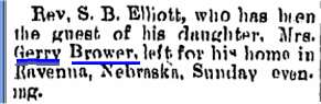 Yuma Pioneer - November 15, 1928 " Mrs. Gerry Brower returned Thursday morning from Denver to which place she was called by the fatal illness of her father Seborn Elliott who died Tuesday evening. He was laid at rest in the cemetery at Haxtun Friday November 9 with military honors. Mr. Elliott was at one time a resident of Pleasant Valley and numbered his friends by his acquaintances."
