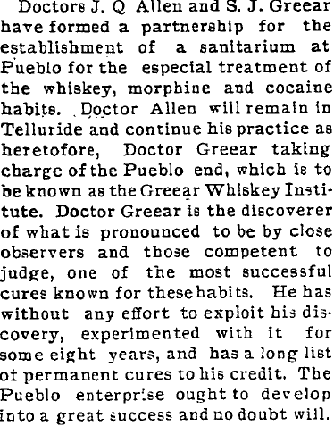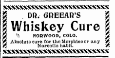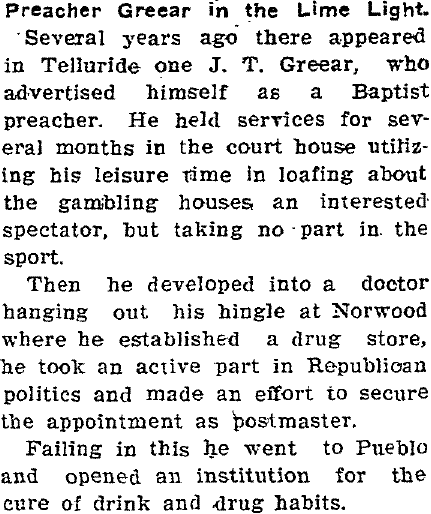 The 1900 Baptist Home Mission Monthly had a Rev S.J. Greear of Telluride, Norwood in 1900-1910, then in La Veta running a sanitarium for the treatment of alcohol and morphine addiction.