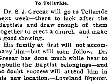 May 3, 1900 Fort Collins "Dr. S.J. Greear has resigned the pastorate of the Baptist church. He expects to continue his residence in Loveland."