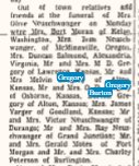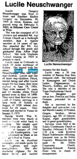 "Sister of Olive Gregory Neuschwanger, Zella Gregory Motes, David Harrison Gregory, Walter R Gregory, Omar Dwight Gregory, Mary Gregory Moran, Lois Gregory Patton, McKinley Gregory, Melvin Gregory, and Lucille Gregory Neuschwanger.