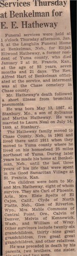 Elijah Elwood Hathaway was born May 13, 1867 in Monroe Ohio, to Sylvanus and Martha Ann GREGG. Hathaway. lived in Benkelman, Nebraska,