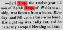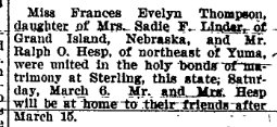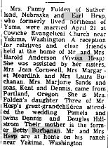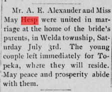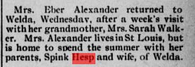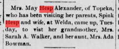 December 20, 1947 Fresno, California "MRS. WAY ALEXANDER -Graveside services were conducted for Mrs. May Alexander, 68, in the Tulare Cemetery today. Mrs. Alexander, a former resident died Wednesday at her home in Chico, after a lingering illness. She was a native of Kansas. The funeral services held in Chico yesterday. She is survived by her husband, and son, Glenn V. Alexander, Earlimart; two daughters, Mrs. Dorothy Rogers of Chester and Mrs. Margaret Pattison brothers; Earl Hesp of Yakima, Wash., Ralph Hesp of Suthern Neb., and Glenn Hesp of Phillips, Neb.: 10 grandchildren and two great grandchildren. " |