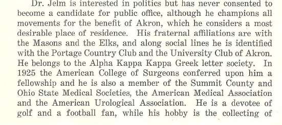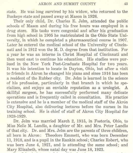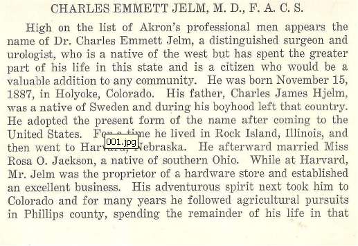 Charles Emmett Jelm (Hjelm) died November 22, 1839 in Akron, Ohio - his residence was Wadsworth, Ohio, and he was a Physiscian / Surgeon. His spouse was Nellie. His death certificate said he was born November 13, 1887 in Holyoke, Colorado, to Charles Hjelm born in Sweden and Rose Jackson born in Ohio.