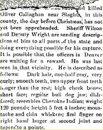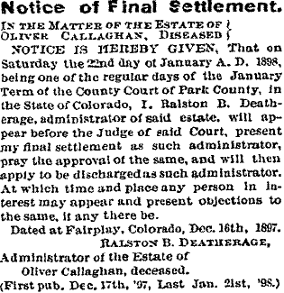 In 1889 a real estate transfer - Oliver Callaghan to Frank Novak, a quarter in 15, 6N 47W - That would be about five miles north of the Timberlake/Eckman claims. Oliver cash-claimed a quarter in August 1890, another next to it in September 1890. Richard Callaghan cash-claimed another quarter in that section in August 1890. Their mother Catherine M. Deatherage, also in August 1890, cash-claimed a quarter in section 9, 6N 47W, and a quarter in section 17 in October 1890. She was living in Park County in 1897 "left for Kansas City Monday to visit her son, Dr. Richard Callaghan and family." TRUSTEE’S SALE (ABSTRACT) Complaint having been entered at this office by Julia Brophy