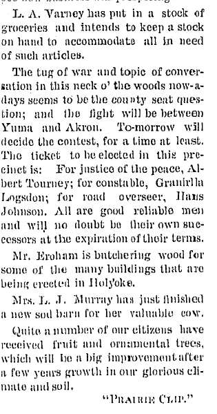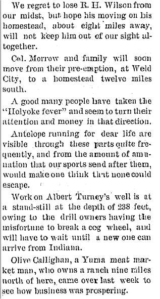 Because the northernmost townships of Yuma County are closer to Holyoke than to Yuma or Wray, the Holyoke newspaper had many mentions of the settlers.