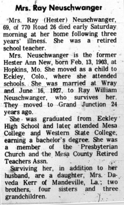 June 29, 1972 "The Floyd Neuschwangers received news of the death of Mrs. Ray Neuschwanger, the former Hester New, at Grand Junction on Saturday."