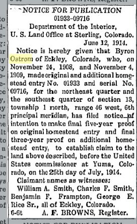 "Bide" and "Brigham" Ostrom arrived in Yuma County in 1908 from Edison, Nebraska, intending to file on land south of Wray.